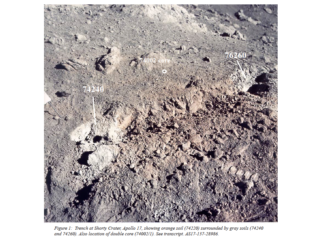 - Station 4, on the rim of Shorty Crater. Gray soil bordering a 1 m wide band of orange soil on the southern edge of a 5-8 cm deep trench.