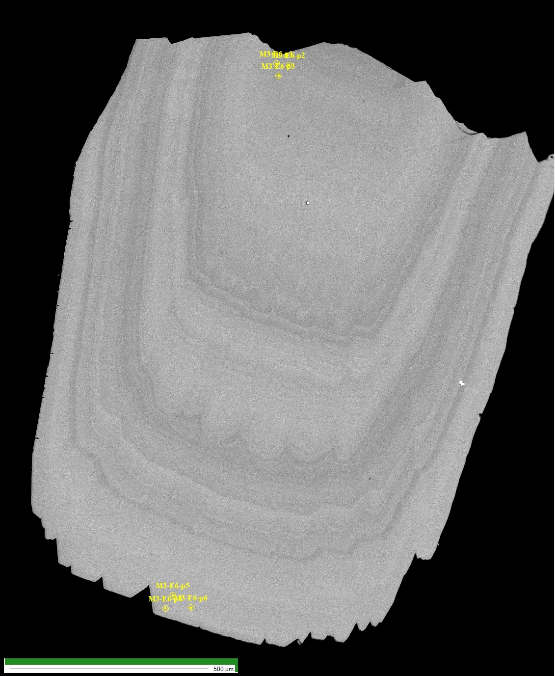 layered Zn-Siderite grain (1.1 x 1.5 mm). Included in a finely polished epoxy resin pellet (# M3)
