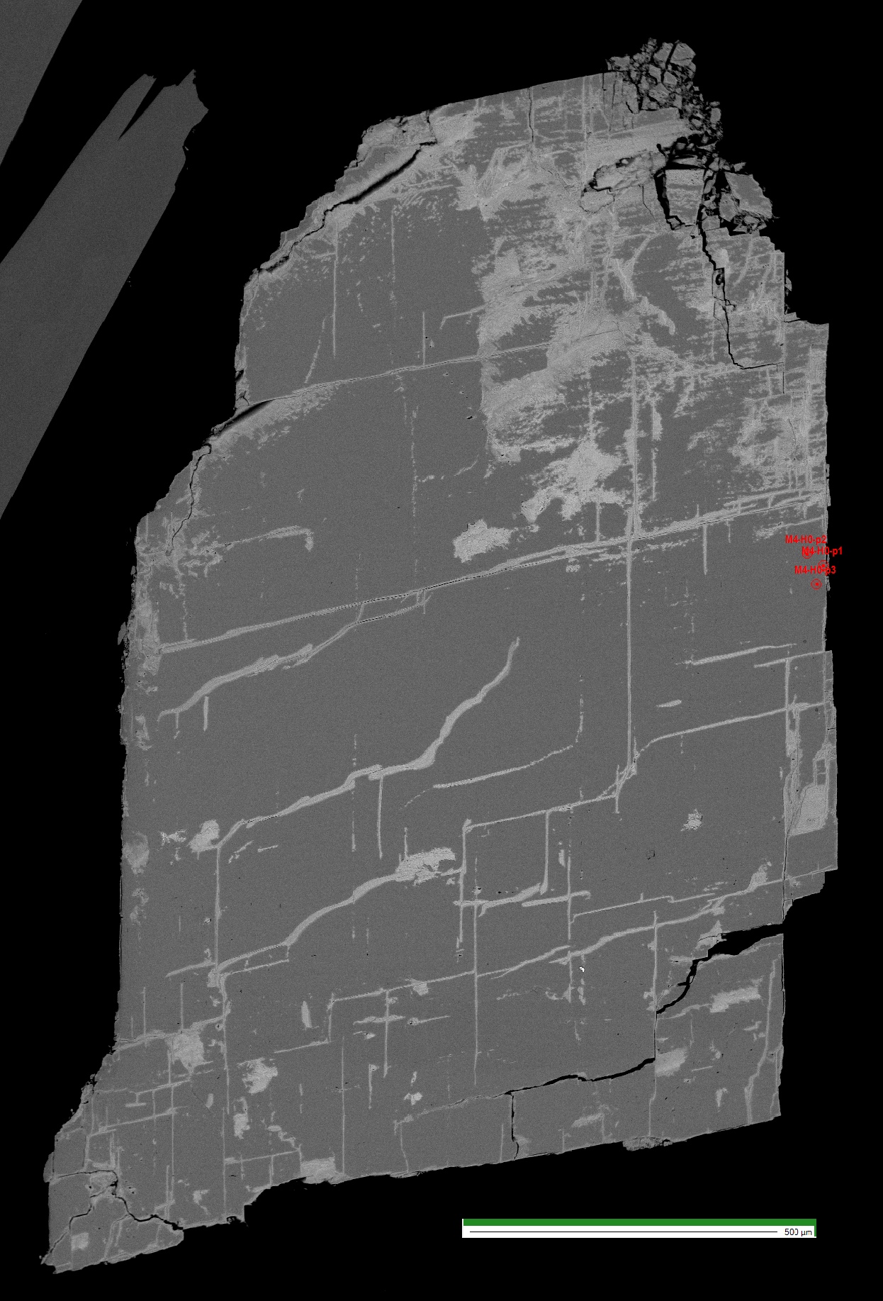 - homogeneous Mg-Siderite grain (1.2 x 2 mm) but with large fractures and holes filled with Fe oxides. Included in a finely polished epoxy resin pellet (# M4))