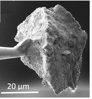 - This sample originate from the bigger mm-sized grains A0064 from the first touchdown site. Its spontaneously detached from the bigger particle. The sample was welded with platinum on tungsten needle using FIB (focused ion beam) microscopes in Saclay.