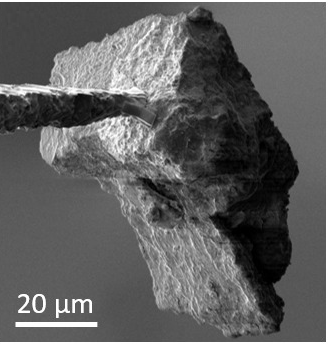 - This sample originate from the bigger mm-sized grains C0046 from the first touchdown site. Its spontaneously detached from the bigger particle. The sample was welded with platinum on tungsten needle using FIB (focused ion beam) microscopes in Saclay.