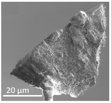 - This sample originate from the bigger mm-sized grains C0002 from the first touchdown site. It was obtained by crushing the surface of the bigger grains The sample was welded with platinum on tungsten needle using FIB (focused ion beam) microscopes in Saclay.